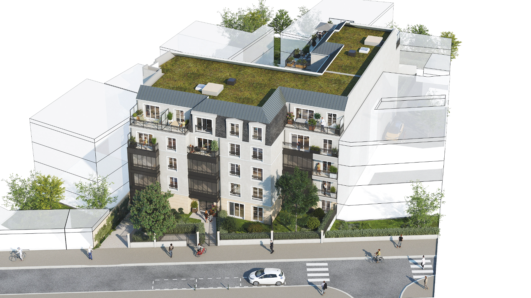 À l’arrière, des jardins privatifs avec pelouses, arbres et arbustes créent un cadre paisible. En attique, de grandes terrasses ouvertes prolongent agréablement les appartements.